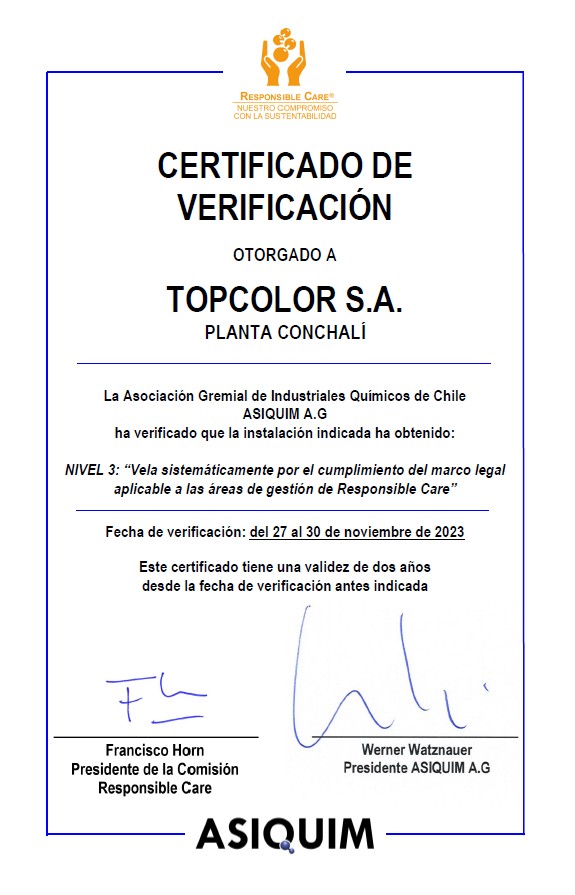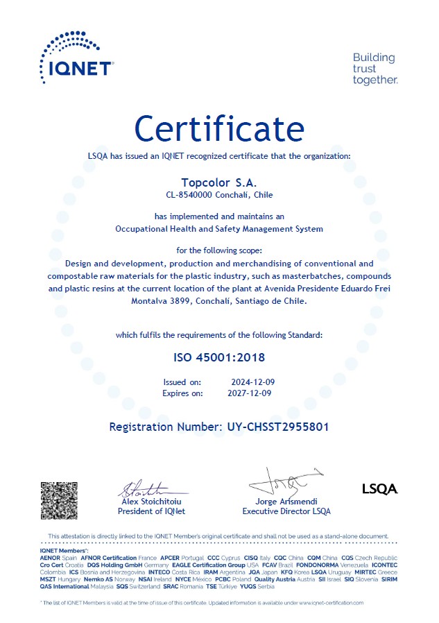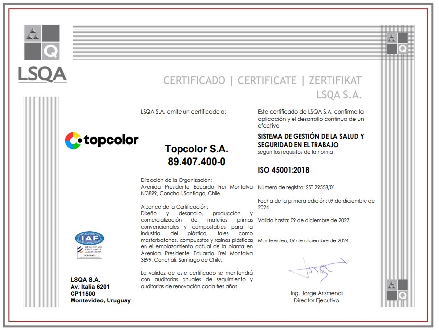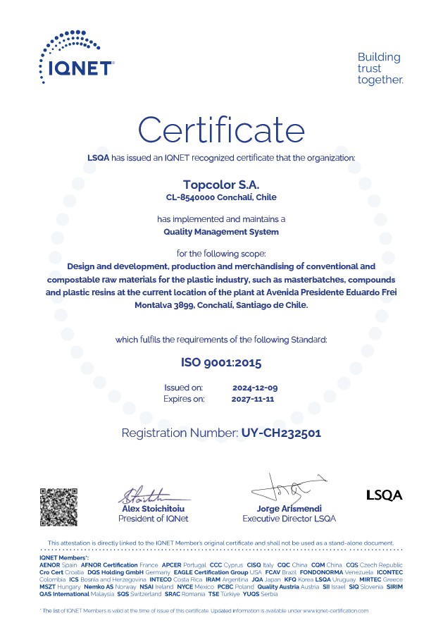 En TOPCOLOR, la certificación LSQA respalda directamente la implementación de las normas ISO 9001:2015 (Gestión de la Calidad) que garantiza la calidad y consistencia de cada lote, optimizando los procesos de producción, trazabilidad y satisfacción de nuestros clientes.